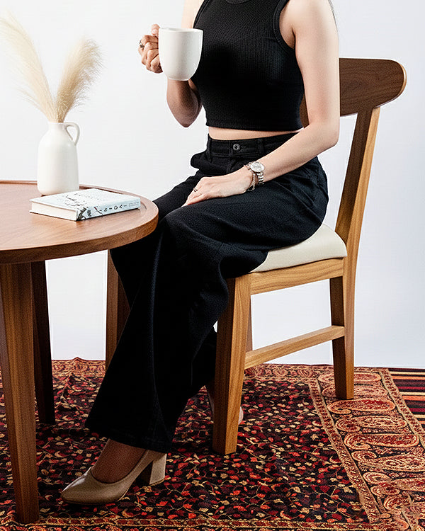 A compact 2-Seater Dining Set handcrafted from solid teak wood, inspired by Scandinavian cafe design. The set includes one round table and Two chairs, featuring clean lines, tapered legs, and soft curves. The chairs come with supportive backrests and cushioned seats finished in premium Italian PU, offering comfort, durability, and timeless elegance perfect for small dining spaces, balconies, or modern homes.