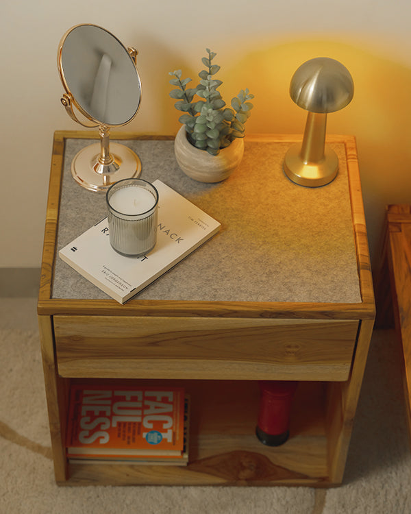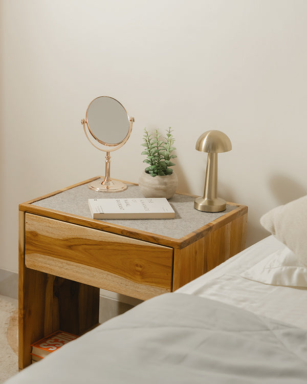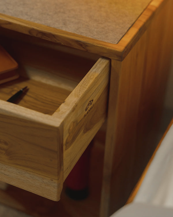 The perfect bedside companion. Echoing the clean lines and subtle curves of the Classic Bed, the Classic Nightstand is crafted from solid teak wood and designed to bring quiet sophistication to your bedroom. With a single drawer and open shelf, it balances form and function—keeping your essentials close and your space calm.