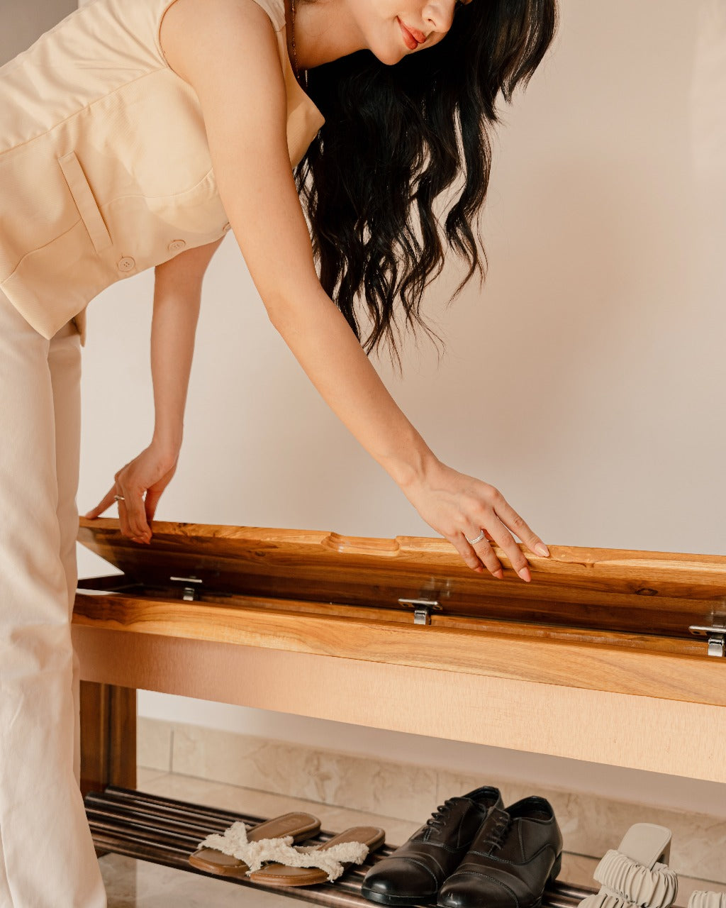 Storage, sculpted. The Curved ShoeRack blends beauty and utility with its signature rounded edges and refined silhouette. Crafted from solid teak wood, it features a hidden storage compartment with a soft-close lid—perfect for stashing accessories, polish kits, or daily essentials. Below, open horizontal rods offer organized space for your shoes or slippers. Designed to sit gracefully in entryways, bedrooms, or anywhere that needs subtle, elevated storage.